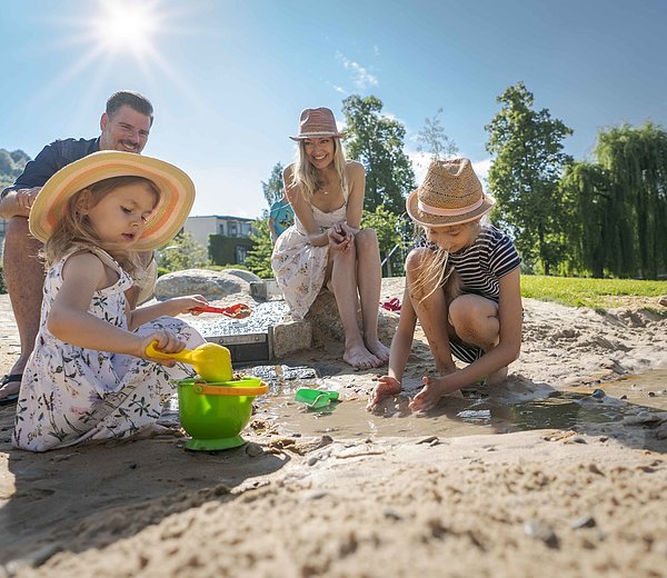 Mittels einer Wippe können die Kleinen das Grundwasser nach oben befördern. Es fließt dann weiter in eine kleine Becherspirale und dann hinab in Richtung Sandfläche. Auf dem Weg dorthin können diverse Schieber betätigt werden. Der Platz reicht locker, damit auch 20 Kinder gleichzeitig ...