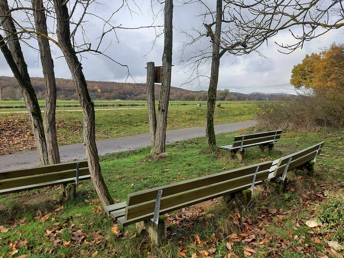 Das Kunstwerk "Zur Rentnerruh gebracht" steht nicht direkt bei den Bänken sondern ein kleines Stück Richtung Süden (Strullendorf) auf der Lichtung neben dem Weg. Hinter dem Kunstwerk wächst eine am 04.04.2006 gepflanzte Kapuzinerlinde.